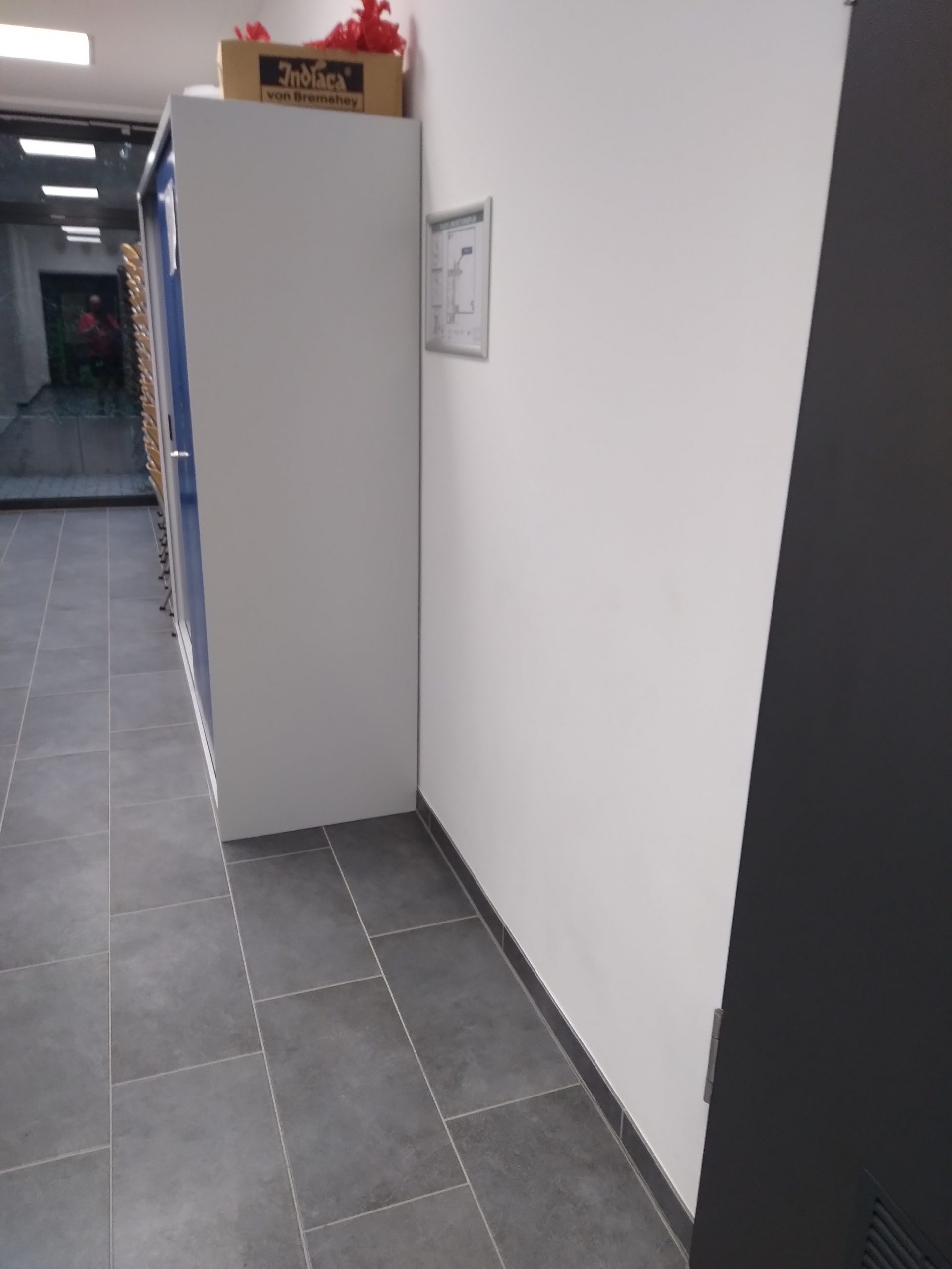 1. Im Hauptflur, ein halbhoher Schrank noch vor dem großen Schrank, unterhalb des Fluchtwegeschildes